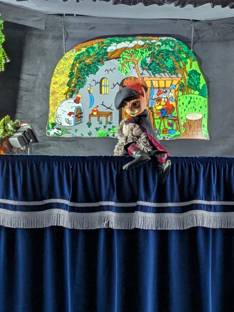 Um 10 Uhr ging es endlich los und alle Kinder durften eintreten. Die Puppenspieler haben sich und die Puppen vorgestellt und erklärt, dass niemand Angst haben muss. So stiefelte der Kater los um seinen Freund den Esel zu retten und sogar noch den „kleinen Prinz“ zu befreien. Die Kinder fieberten mit, denn der böse Zauberer durfte nicht gewinnen.